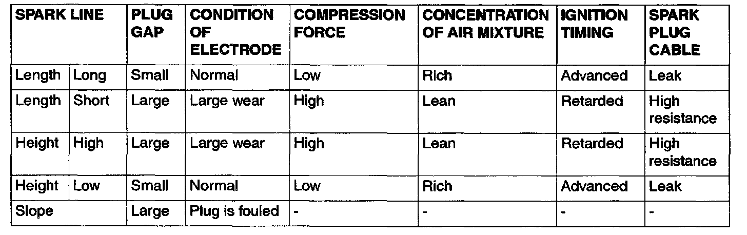 The height, length and slope of the spark line (refer to abnormal waveform examples 1, 2, 3 and 4) show the following trends.