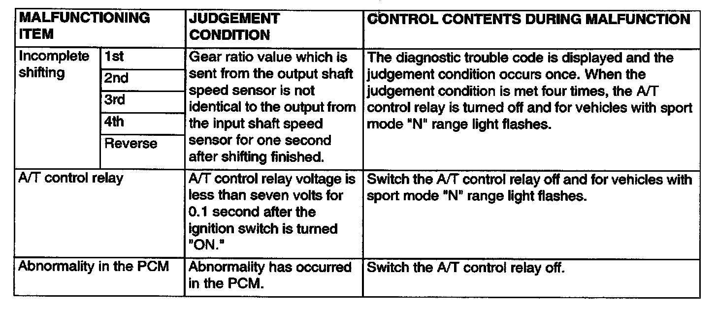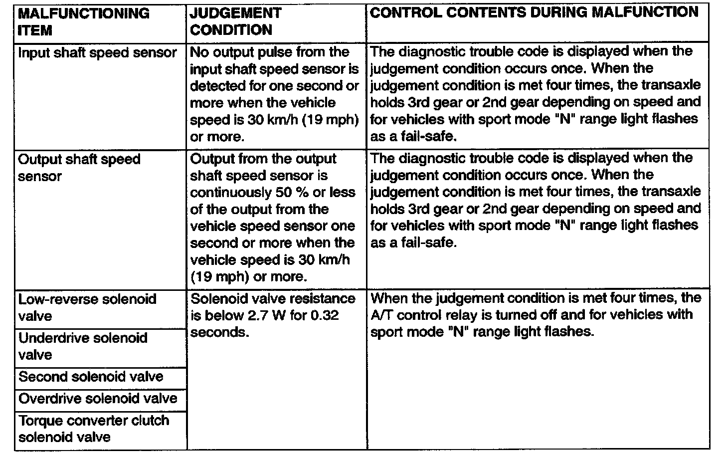 When malfunctions of the main sensors or actuators are detected by the PCM, the transaxle is controlled by preset control logic to maintain safe conditions for driving.