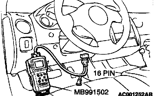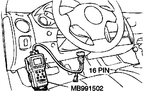 CAUTION: To prevent damage to scan tool MB991502, always turn the ignition switch to "LOCK" (OFF) position before connecting or disconnecting scan tool MB9911502.