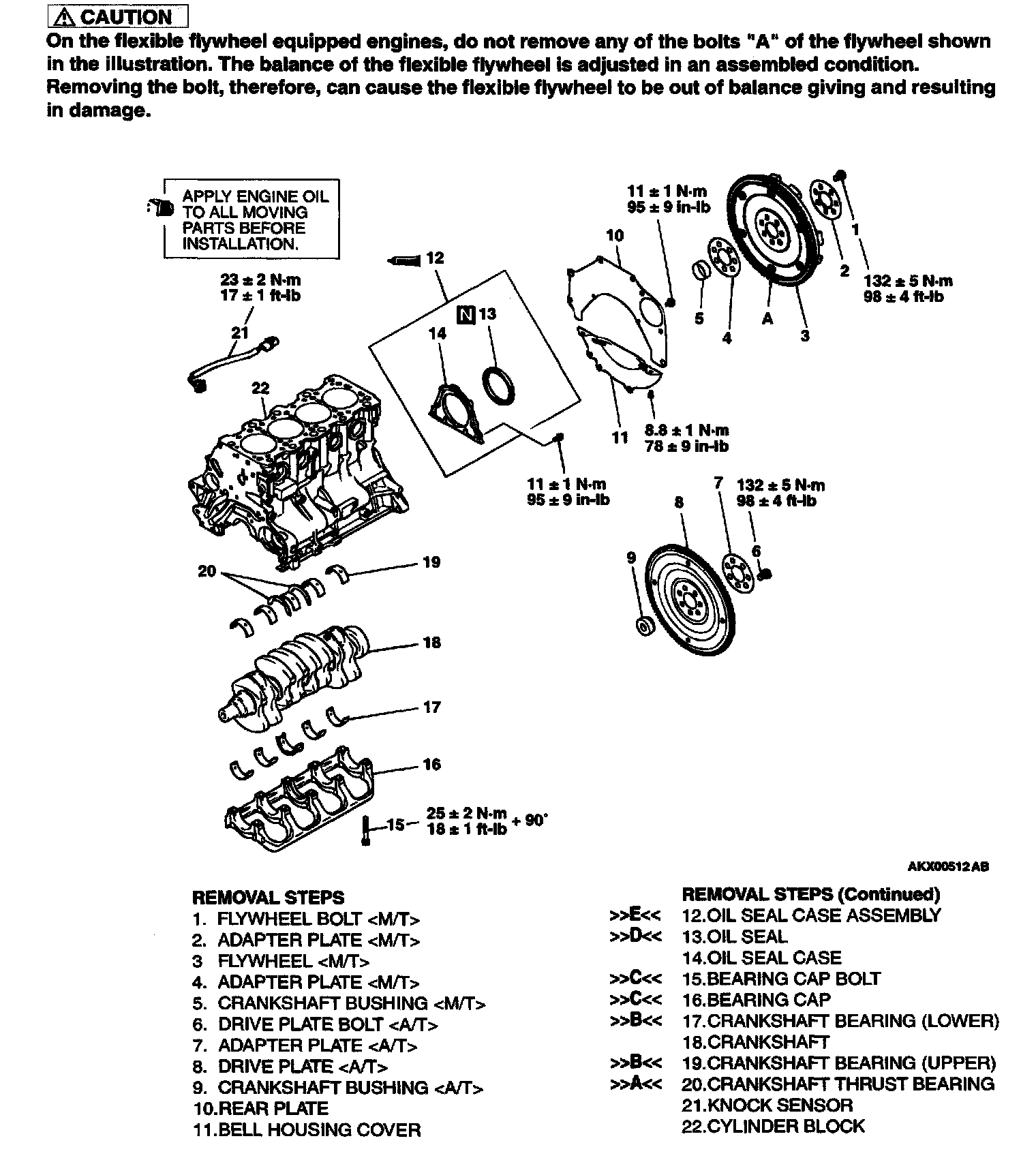 Flywheel Bolts: 132 ± 5 Nm (98 ± 4 ft.lb)