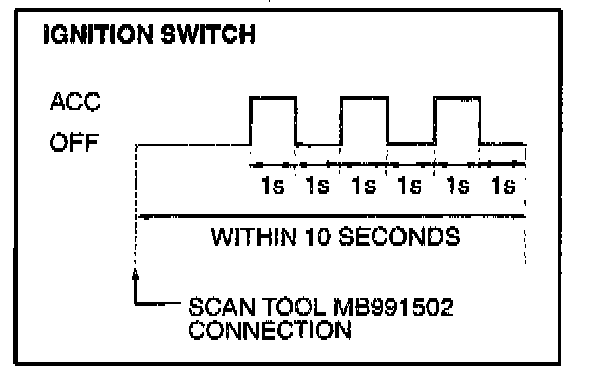 4. Within 10 seconds after connecting the scan tool, turn the ignition switch to the ON or ACC position and then back to OFF for 1 second. Do this procedure a total of three times.