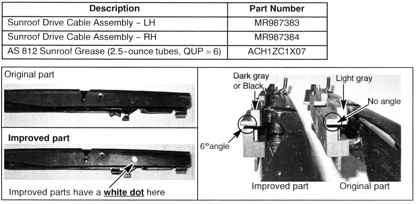 On some affected vehicles, the sunroof may judder or vibrate during opening/closing operation. In some cases, it may be necessary to replace the drive cable assemblies. This bulletin describes how to install the new, improved drive cable assemblies. The new drive cable assemblies have improved shoes to decrease sliding friction. Replacement parts with the improved shoes have a date code mark of 8/13/01 or later. Refer to the PARTS INFORMATION section of this bulletin for how to identify the new shoes.