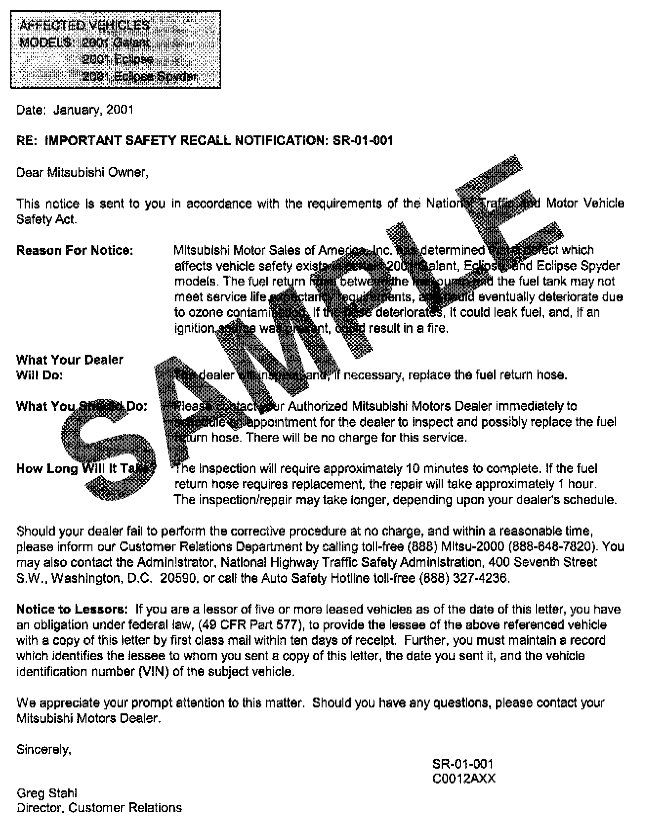 A letter will be sent to all owners of affected vehicles telling them to bring their vehicle to their Mitsubishi Motors dealer to have the fuel return hose inspected. A copy of the customer notification letter appears in this bulletin.