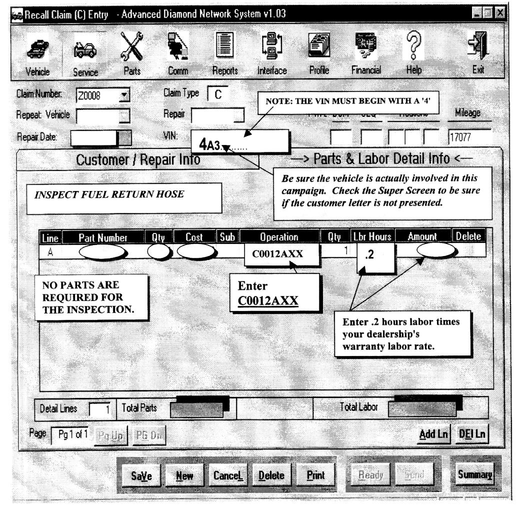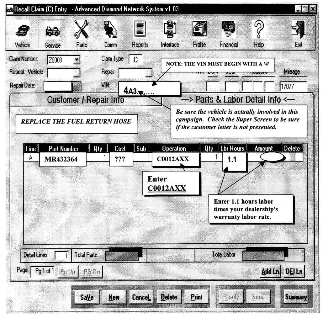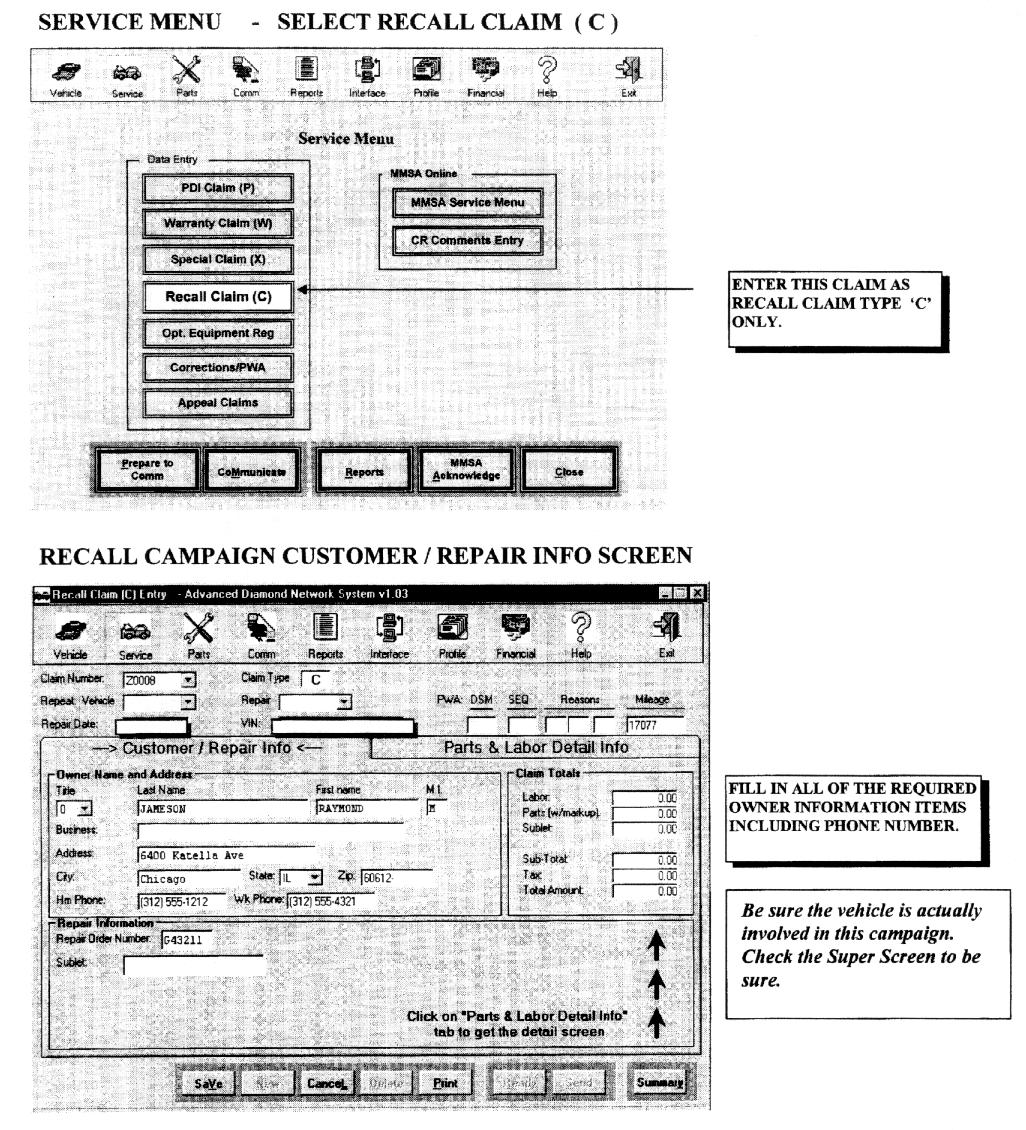Claims for this campaign must be entered as Recall type "C" claims on your Diamond Network Service Menu. Sample claim screens are shown on the next pages.