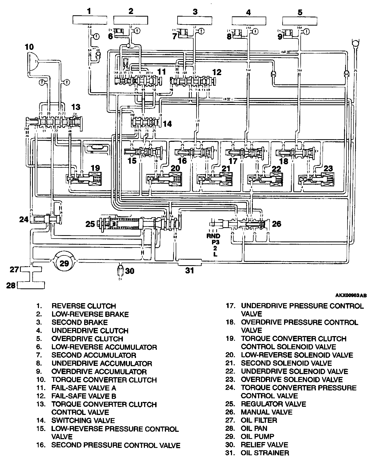 Parts related to oil pressure regulation are the oil pump, which pressurizes the oil; the regulator, which controls the pressure setting; the solenoid valve, which changes the oil pressure with electrical signals; the pressure control valve, which controls the oil pressure coming from the solenoid valve that effects each clutch and brake; each kind of valve, which carry out the retention of the oil pressure through the lines; and finally the valve body, which houses all the valves.
