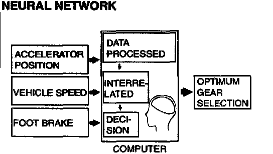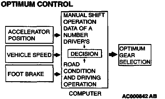 1. The shift patterns found satisfying by the typical driver for all ranges of driving are stored in the computer's memory. The computer uses this data to analyze road conditions and the driver's style of operation, and then outputs the optimal shift patterns stored in its memory to best match the conditions.