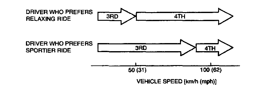 2. If the computer determines from the driving patterns that the driver is one who enjoys a relaxed, unhurried style, it adjusts timing to execute up-shifts at a lower engine speed to provide a smooth, quiet ride. On the other hand, if the computer determines the driver to prefer a sporty ride, it adjusts timing to shift up at a higher engine speed to provide more powerful response.