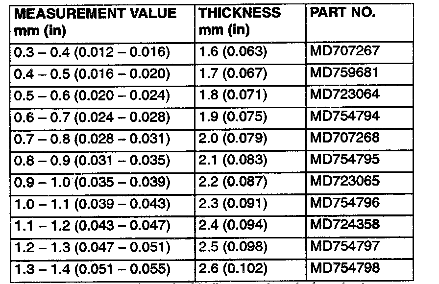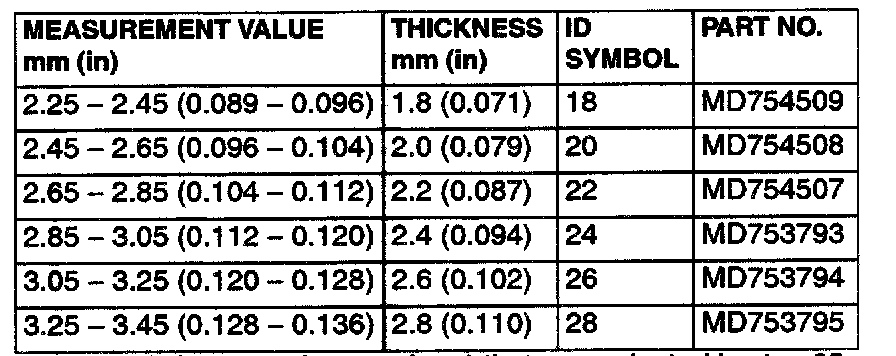 79. Use a micrometer to measure the thickness of the crushed solder beads and record the measured value. Add 0.045 to 0.105 mm (0.0018 to 0.0041 inch)* to the measured value and select a spacer with the corresponding thickness. Adjustment spacer sizes are all listed on R2313-79. Select the most suitable one from among those listed.