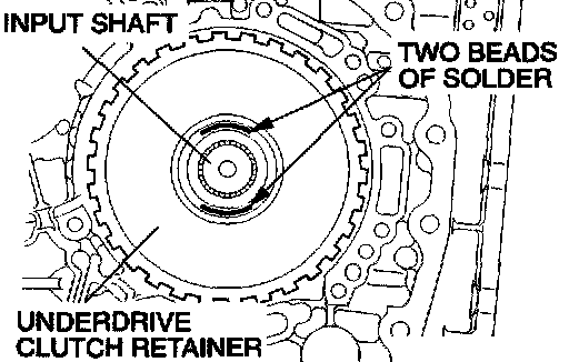 59. Place two beads of solder [each 10 mm (0.39 inch) in length, 3.5 mm (0.14 inch) in diameter] on the underdrive clutch retainer as shown in the illustration.