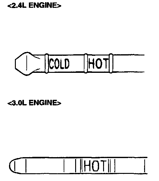 5. Check that the A/T fluid level is at the "HOT" mark on the dipstick. If the A/T fluid level is lower than this, pour in more DIAMOND ATF SP III, ATF SP II M or equivalent until the level reaches the "HOT" mark.