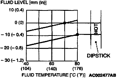 NOTE: If it takes some amount of time until the A/T fluid reaches its normal operating temperature [70 - 80°C (158 - 176°F), check the A/T fluid level by referring to the left diagram.