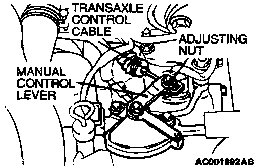 6. Gently pull the transaxle control cable in the direction of the arrow, until the cable is taut. Tighten the adjusting nut.