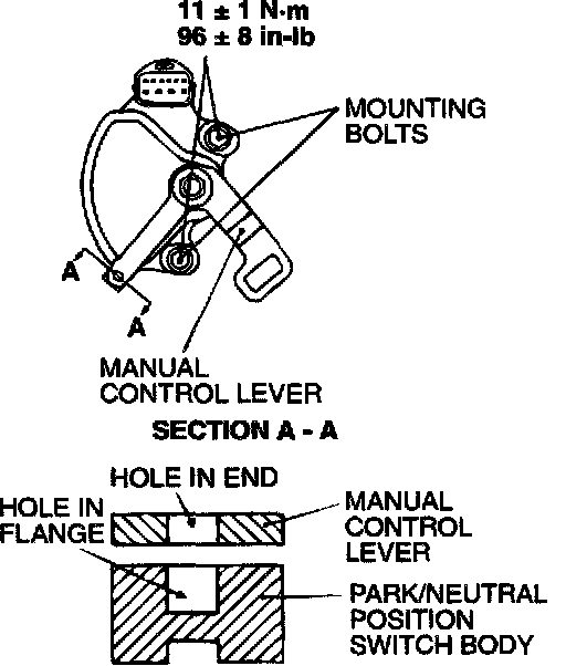4. Loosen the park/neutral position switch body mounting bolts and turn the park/neutral position switch body so the hole in the end of the manual control lever and the hole (section A A in the figure on the left) in the flange of the park/neutral position switch body flange are aligned.