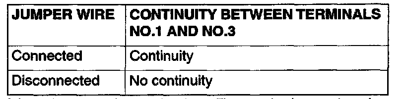 3. Check the continuity between terminal 1 and terminal 3 of the A/T control relay when the jumper wires are connected to and disconnected from the battery.
