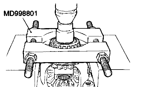 1. Using special tool MD998801, support the taper roller bearing, and then set them on the press.
