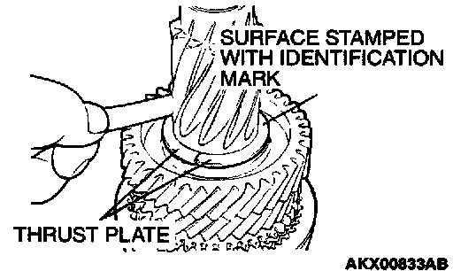1. Install the thickest thrust plates that can be fitted in the groove of input shaft. Install the thrust plate so the surface stamped with the identification mark is facing up.
