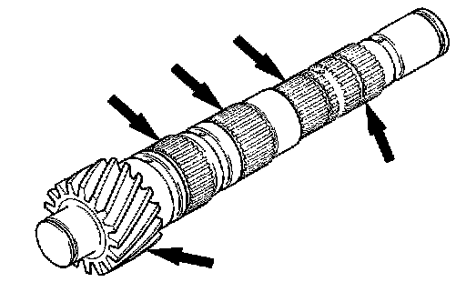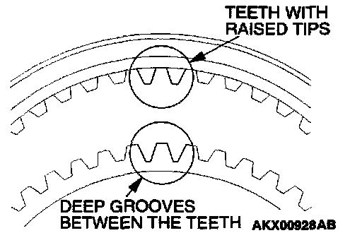 2. Install the synchronizer sleeve so that the areas with teeth that have raised tips (three areas total) are aligned with the areas on the synchronizer hub that have deep grooves between the teeth (three areas total).