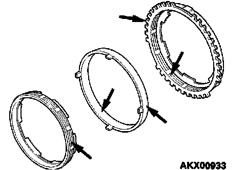 CAUTION: There is a 5th speed synchronizer ring and a reverse synchronizer ring. Be careful not to confuse the two when installing, as a mistake can effect the shift feeling.