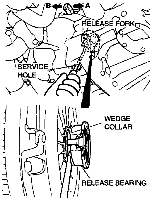 2. Insert a flat-tipped screwdriver into space between the release bearing and the wedge collar while pushing the release fork to the "A" direction by hand slightly.