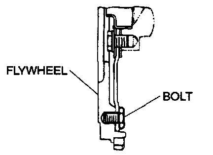 CAUTION: Do not remove the flywheel mounting bolt shown by the arrow. If this bolt is removed, the flywheel will become out of balance and damaged.