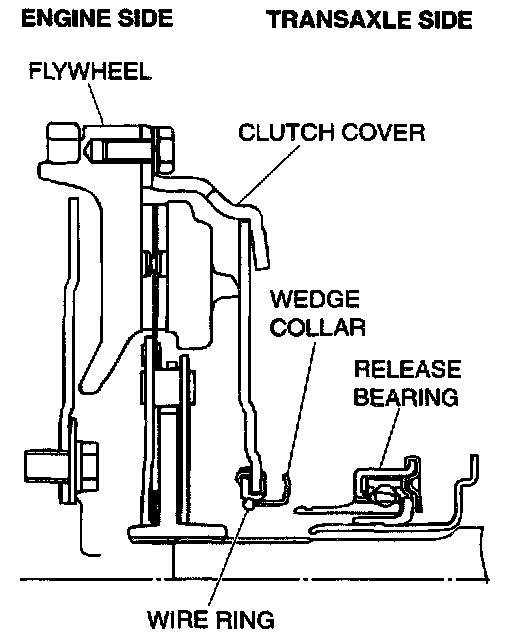 CAUTION: On the pull-type clutch, do not roll the transaxle assembly when installing it to the engine. If the transaxle assembly is rolled, the wedge collar and the wire ring will be deformed, causing a clutch malfunction due to improper engagement of the wedge collar and the wire ring.