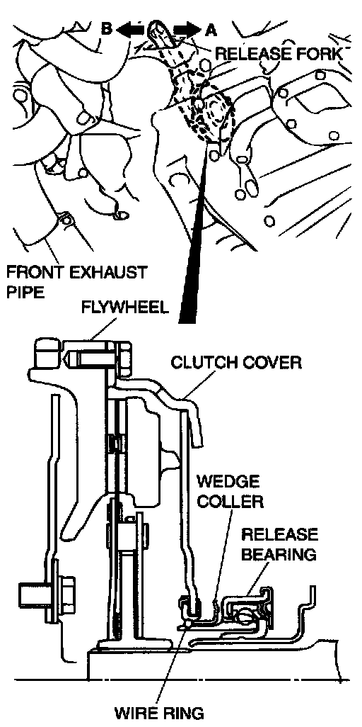 1. Move the release fork to the "A" direction, and engage the release bearing with the wedge collar.