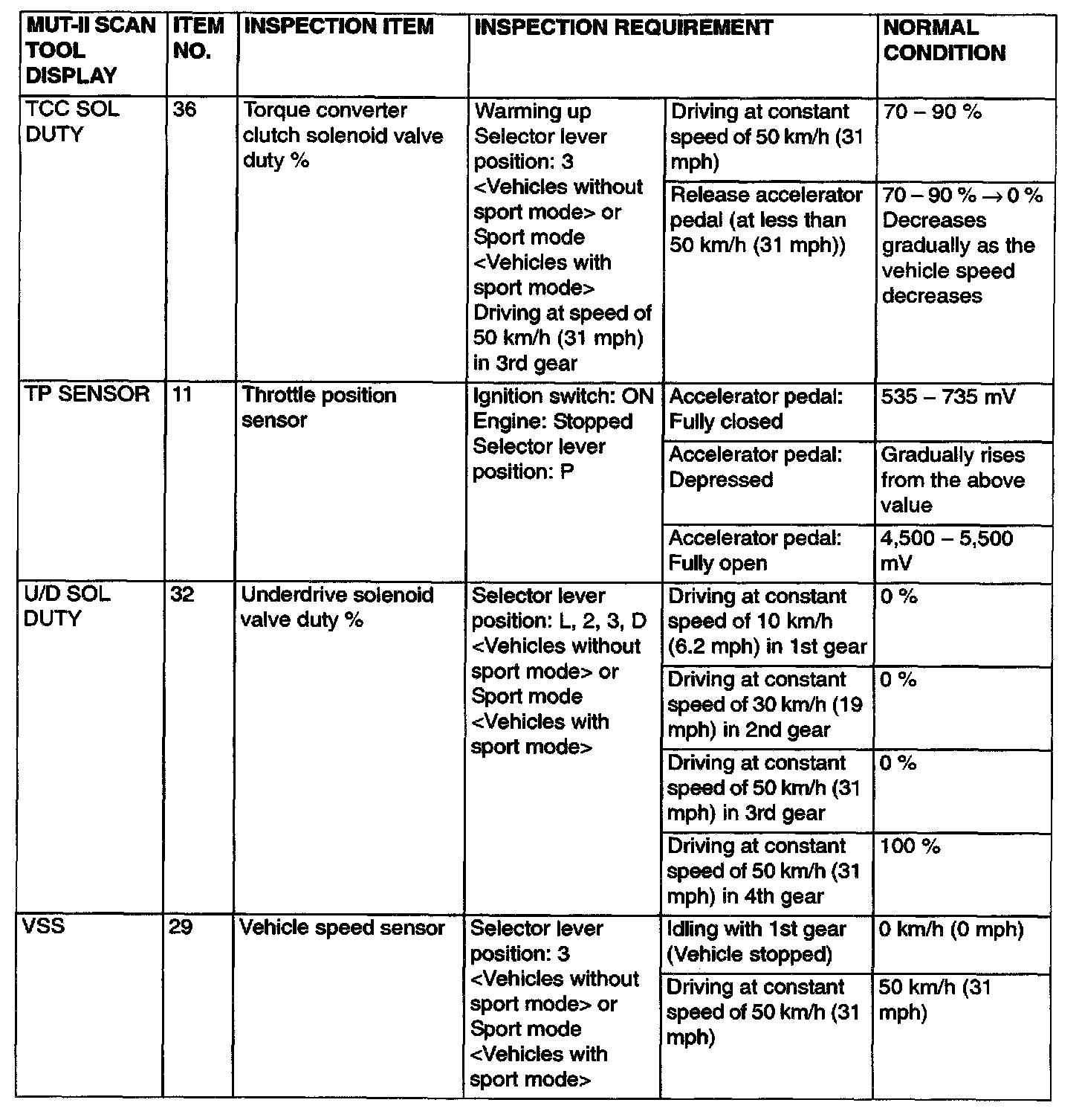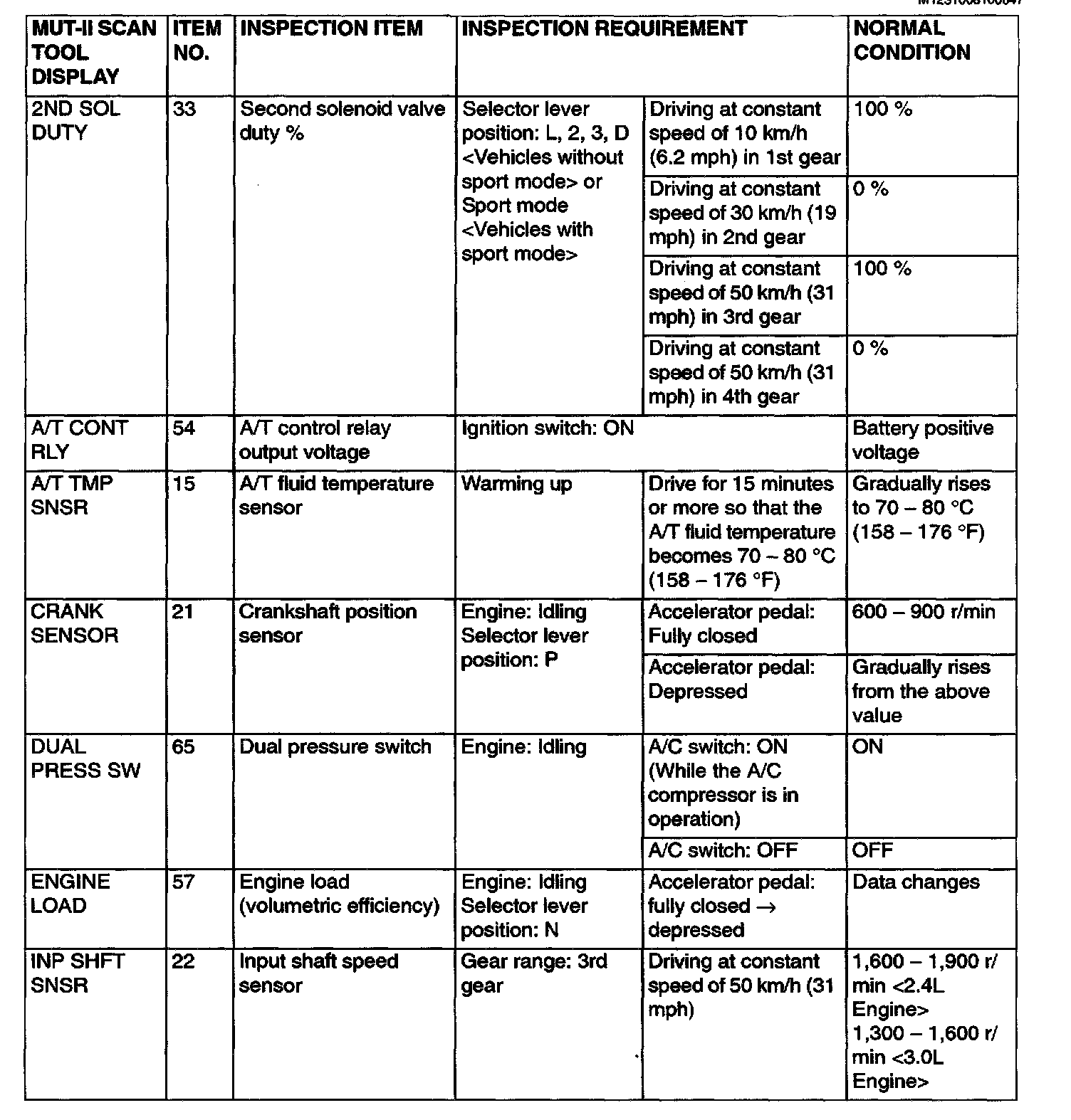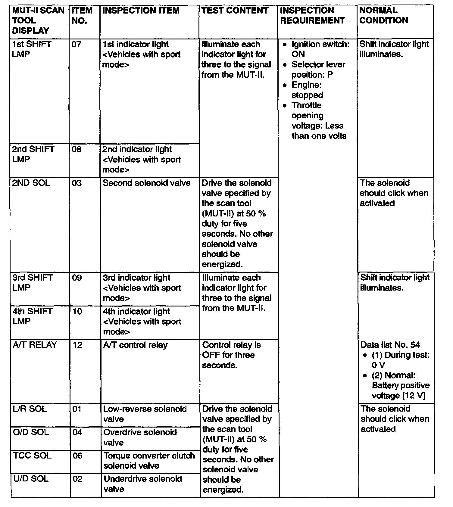 PCM TERMINAL VOLTAGE REFERENCE CHART FOR TRANSAXLE OPERATION