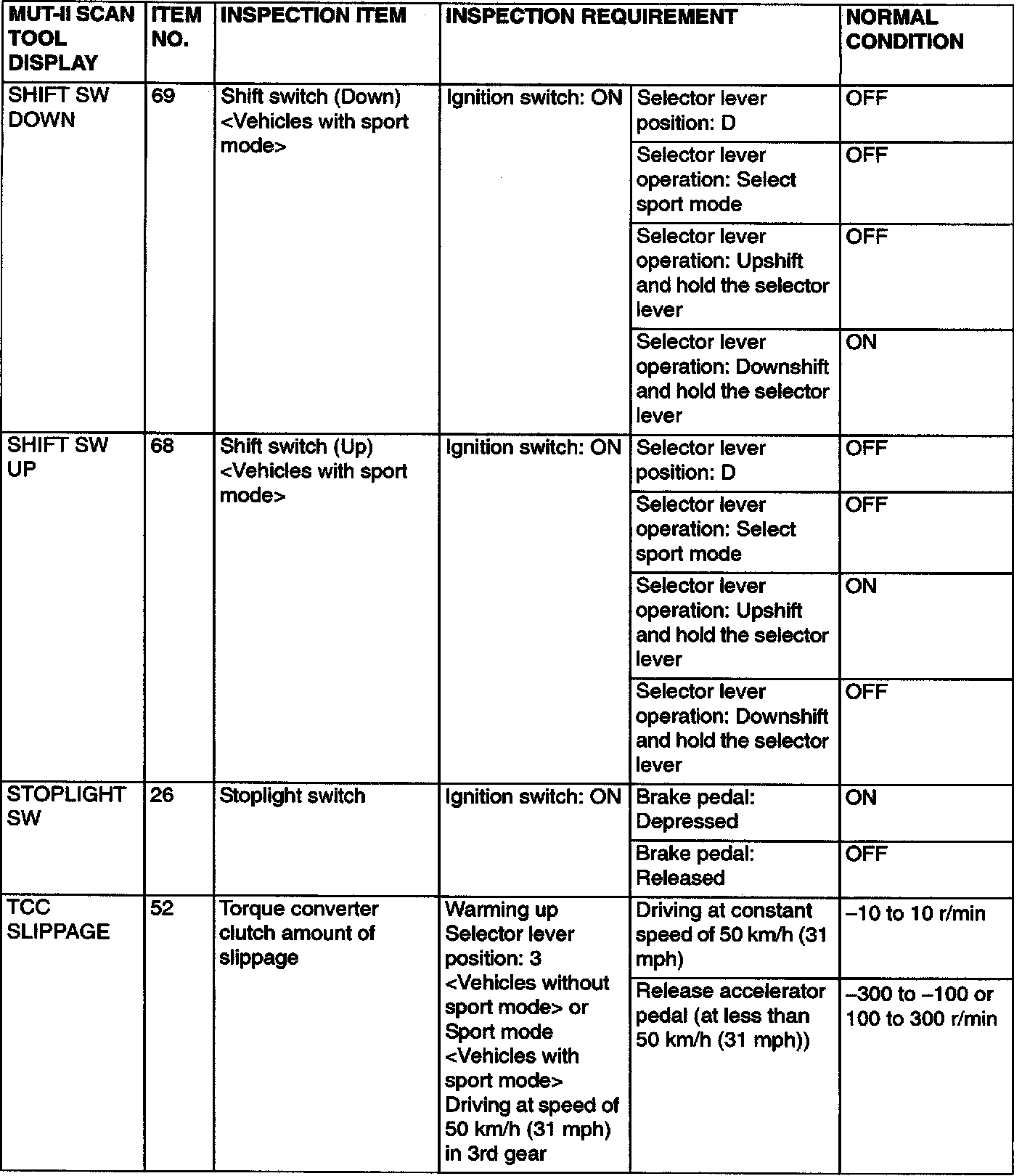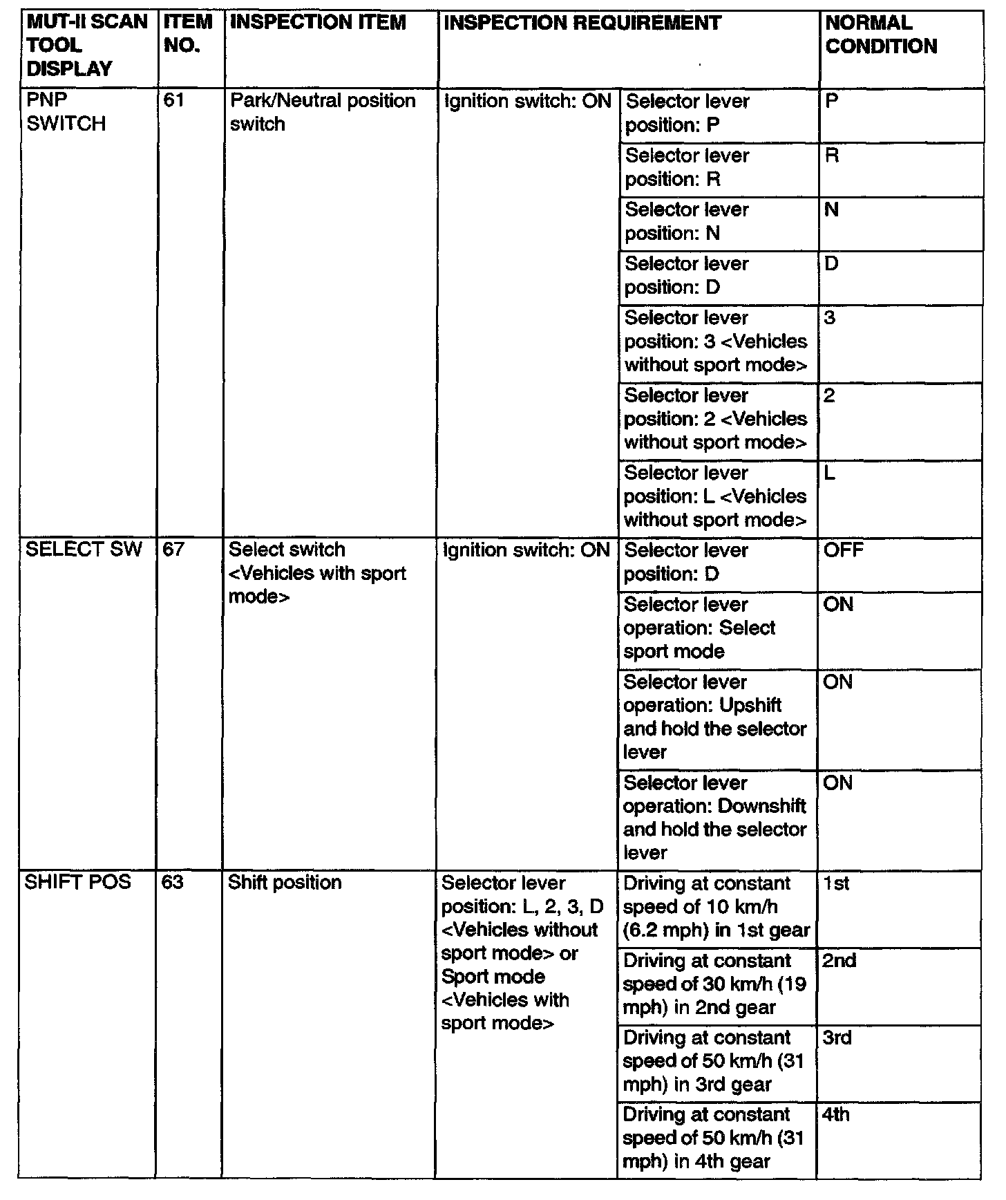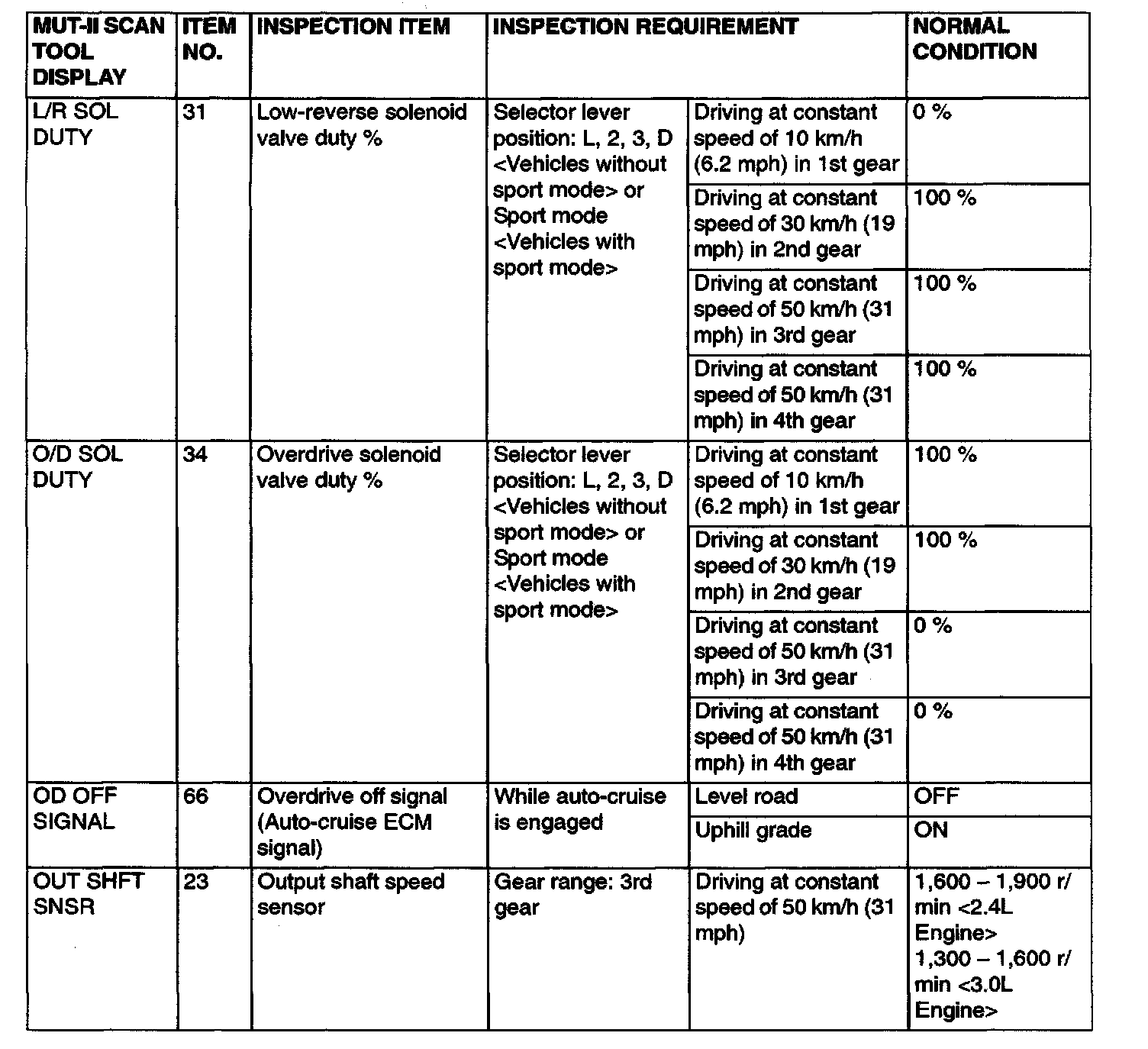 PCM TERMINAL VOLTAGE REFERENCE CHART FOR TRANSAXLE OPERATION