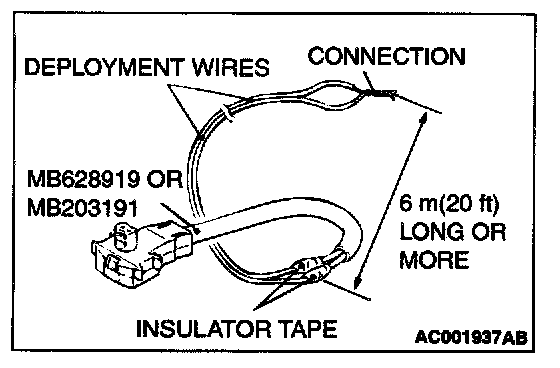 3. Connect deployment wires, each 6 meters (20 feet) or longer, to the two leads of special tool MB628919 or MB203491, and cover the connections with insulation tape. The other ends of the deployment wires should be connected to each other (short-circuited), to prevent sudden unexpected deployment of the air bag module.