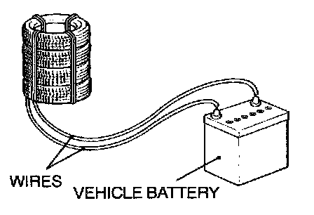 7. At a location as far away from the air bag module as possible, and from a shielded position, disconnect the two connected wires from each other, and connect them to the two terminals of the battery (which has been removed from the vehicle) to deploy the air bag.