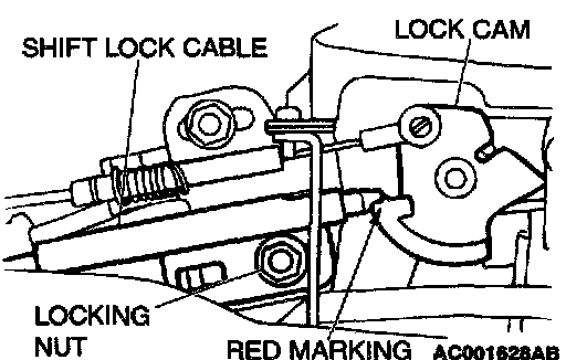 4. Tighten the locking nut so that the end of the shift lock cable comes above the red marking of the lock cam.