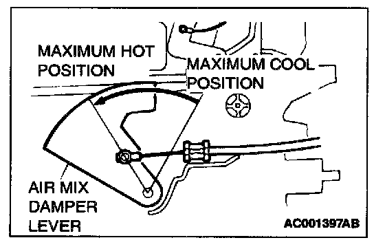 2. Set the air mix damper lever of the heater/cooler unit to the maximum hot position as shown in the illustration, and then connect the cable to the lever pin.