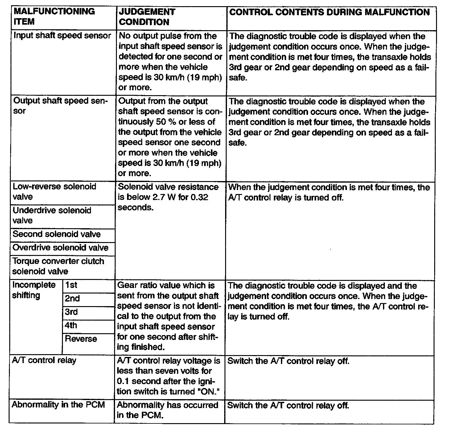When malfunctions of the main sensors or actuators are detected by the PCM, the transaxle is controlled by preset control logic to maintain safe conditions for driving.