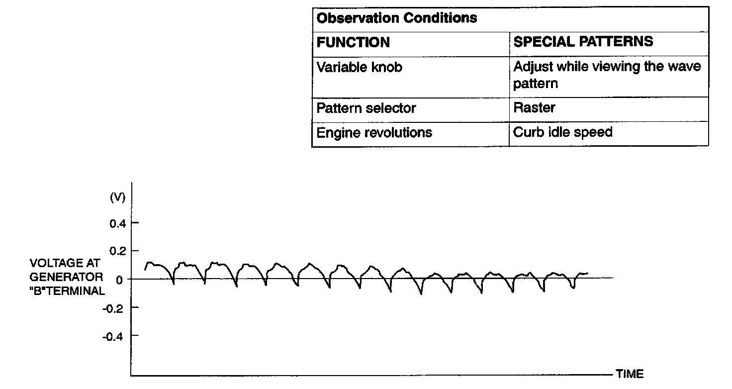 NOTE: The voltage waveform of the generator "B" terminal can undulate as shown at left. This waveform is produced when the regulator operates according to fluctuations in the generator load (current), and is normal for the generator. If the ripple height is abnormally high (approximately 2 V or more during idling), the wires between the generator B terminal and the battery have broken due to fuse blowing, etc. The generator is usually operating properly.
