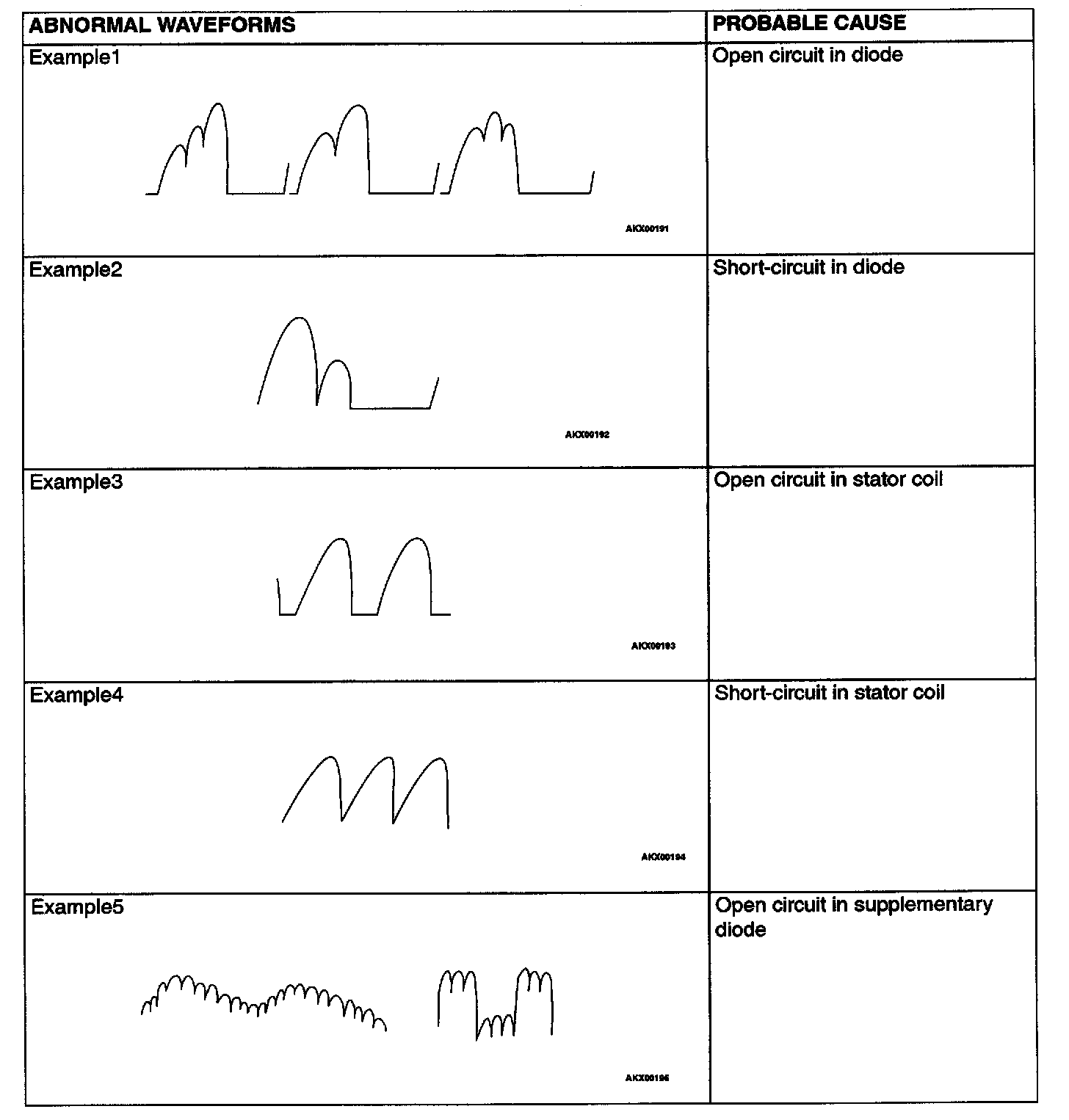 NOTE: Identification of abnormal waveforms is easier when there is a large output current (regulator is not operating). (Waveforms can be observed when the headlights are illuminated.)