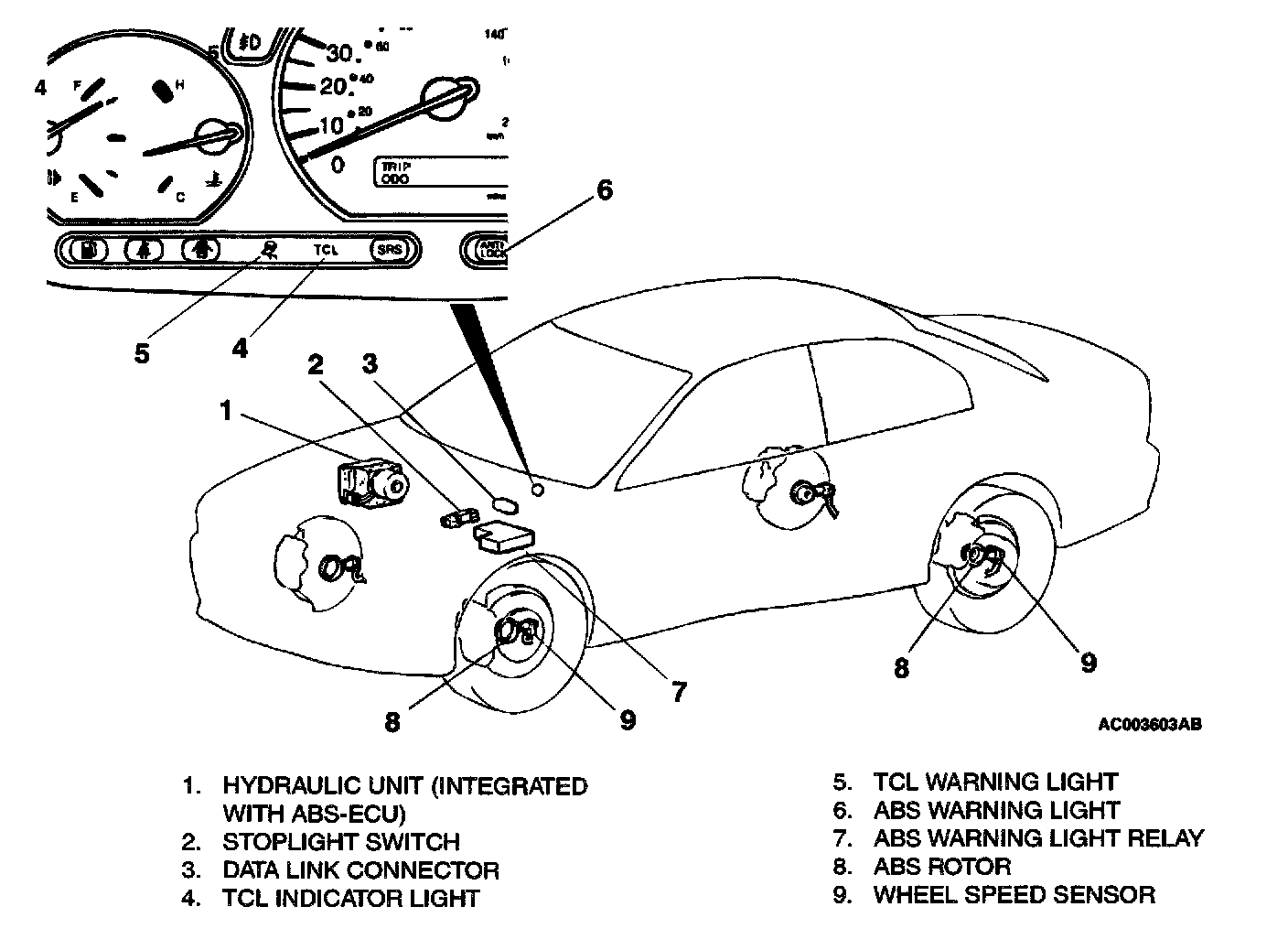 GENERAL INFORMATIONIf the throttle is opened excessively when a vehicle is started or accelerated, the driving wheels may slip due to excessive drive torque. This adversely affects startability, accelerating ability or controllability. To ensure startability, accelerating ability and controllability, this TCL system will prevent wheel slip by controlling (applying) brake fluid pressure to the drive wheels to adjust the driving torque according to road conditions. Each wheel-speed sensor detects wheel speed and converts it to an electric signal. The ABS-ECU determines which wheel begins to slip according to that signal. If the ABS-ECU determines wheel slip, it activates the solenoid valves and the pump inside the hydraulic unit to prevent the wheel slip by applying brake ensuring controllability. This TCL system is controlled by the ABS-ECU, and the TCL components are shared by the ABS system. If the ABS hydraulic unit is faulty, the ABS-ECU must be replaced.