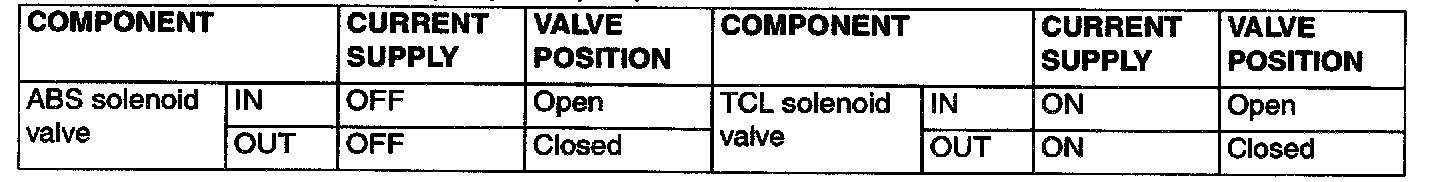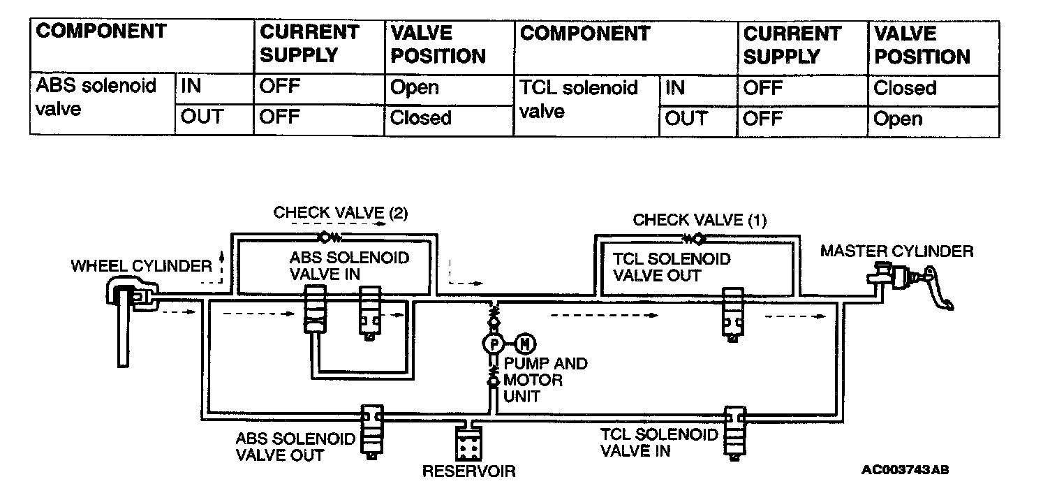 The TCL solenoid valve (OUT) and ABS solenoid valve (IN) are open while the TCL solenoid valve IN and ABS solenoid valve (OUT) are closed. If the brake pedal is depressed, the fluid pressure in the master cylinder flows through the TCL solenoid valve (OUT), check valve 1 and ABS solenoid valve (IN) to the wheel cylinder operating the brake.