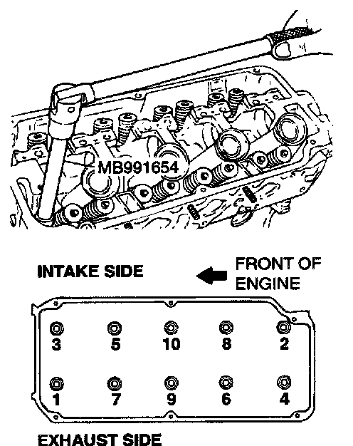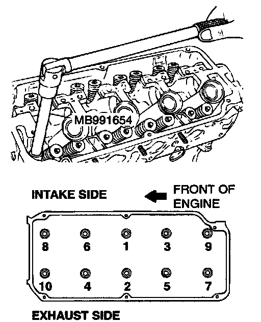 Using special tool MB991654, loosen the bolts in two or three steps in the order of the numbers, then remove the cylinder head assembly.