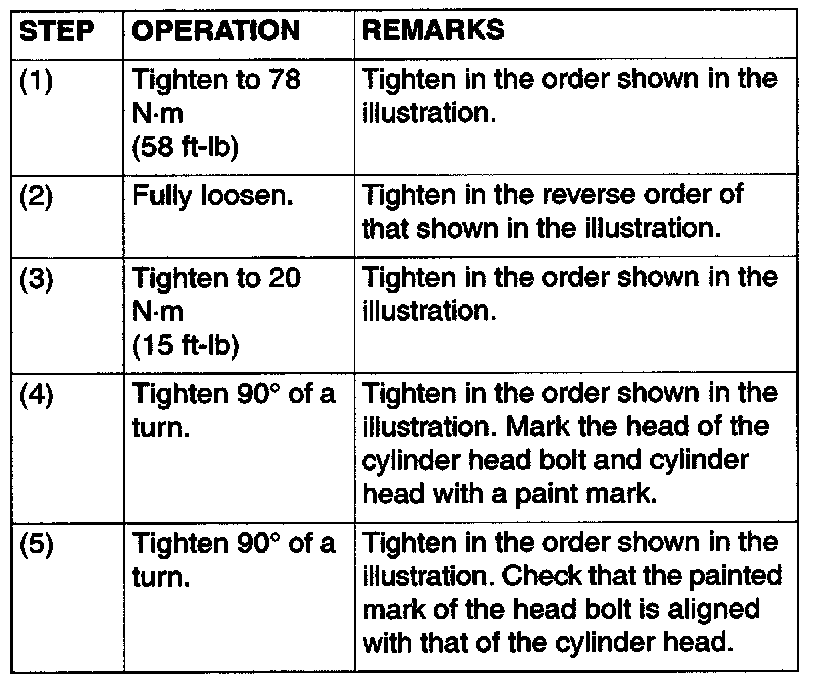 - Always tighten cylinder head bolts at a 90 degree angle. If it is less than 90 degree angle, the bolt will loosen.