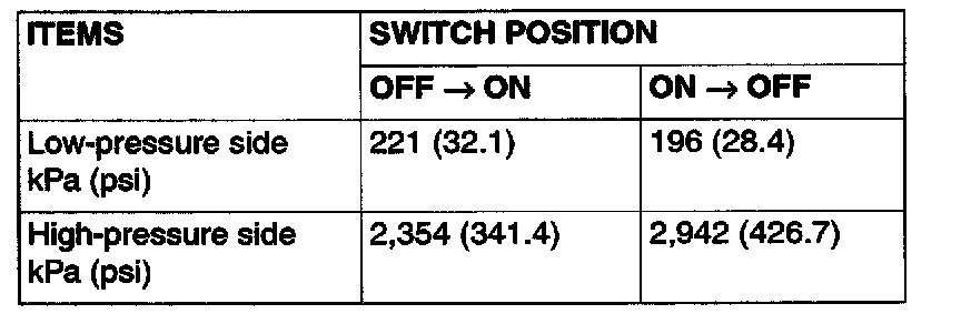 3. When the high/low pressure sides of the dual pressure switch are at operation pressure (ON) and there is continuity between the respective terminals, then the condition is normal. If there is no continuity, replace the switch.