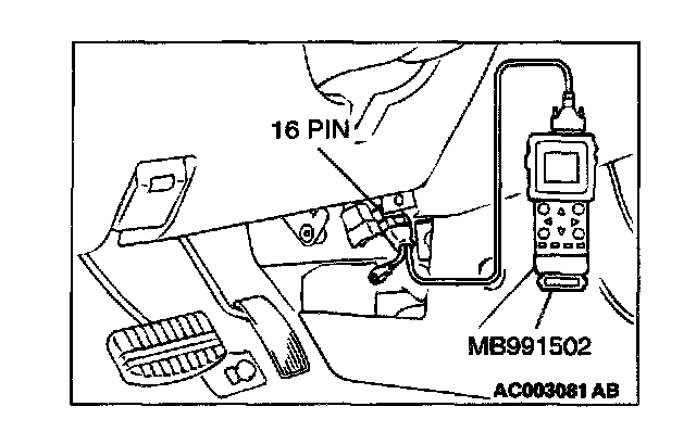 CAUTION: To prevent damage to scan tool MB991502, always turn the ignition switch to the "LOCK" ("OFF") position before connecting or disconnecting scan tool MB991502.