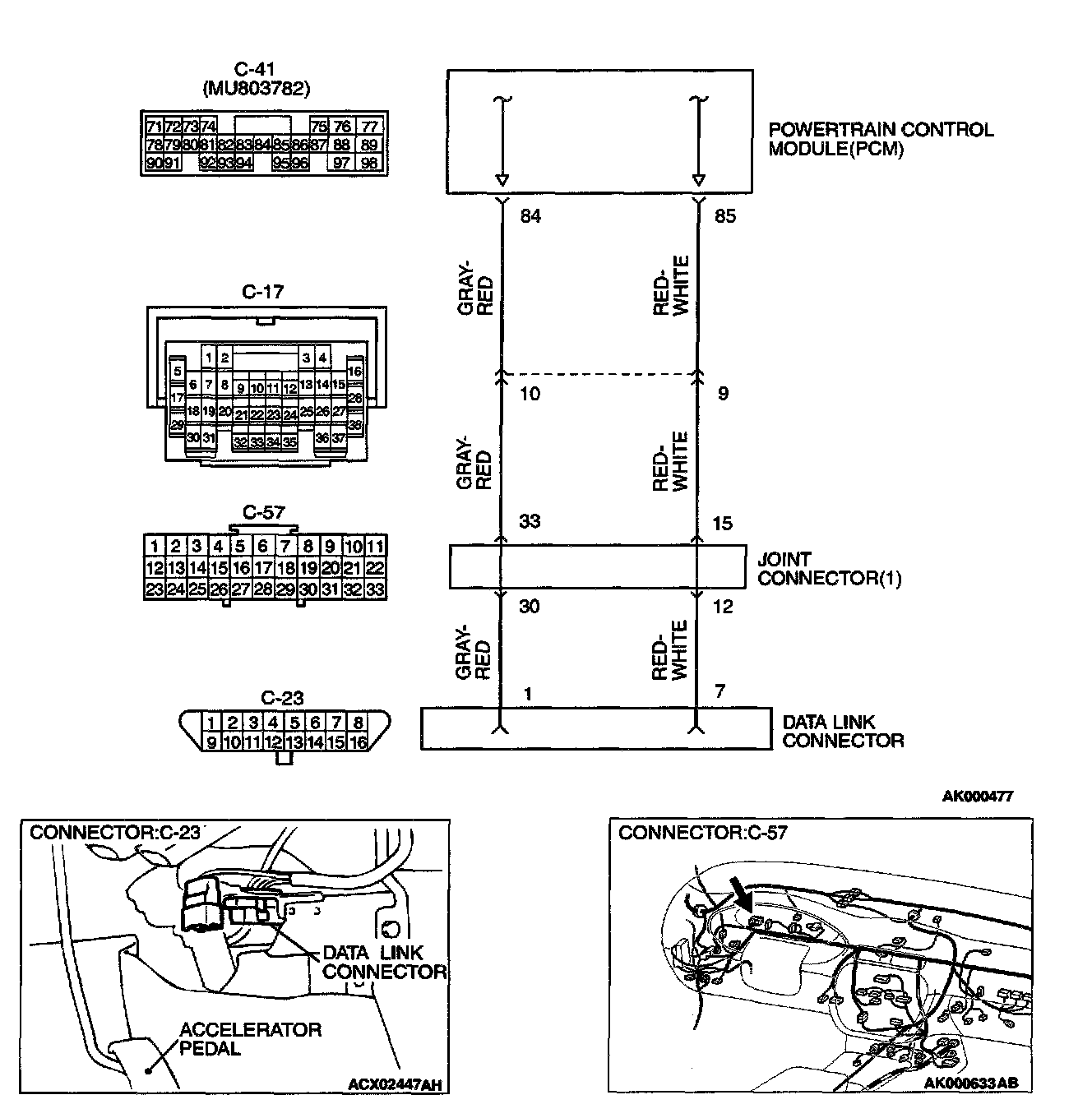 STEP 2. Check for open circuit, short circuit to ground and harness damage between data link connector C-23 terminal 1 and PCM connector C-41 terminal 84.
