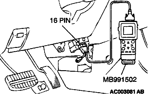 CAUTION: To prevent damage to scan tool MB991502, always turn the ignition switch to the "LOCK" (OFF) position before connecting or disconnecting scan tool MB991502.