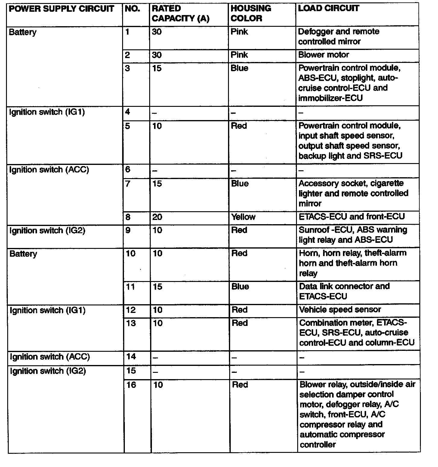 Multi-Purpose Fuses 1 - 16 (In Junction Block):