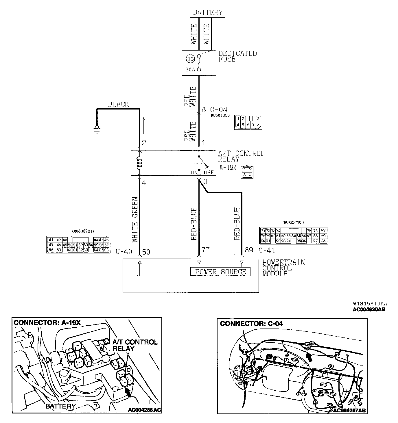 - A/T control relay (terminal number 1) receives the battery positive voltage from the battery
