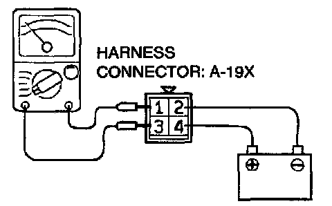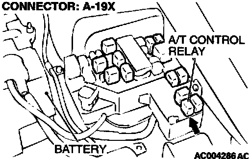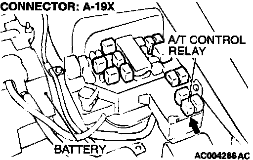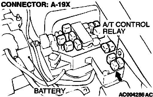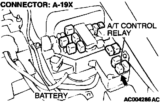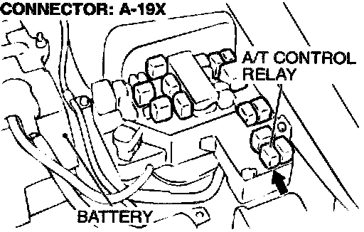 2. Use jumper wires to terminal 2 of A/T control relay connector A-19X to the negative battery terminal, and terminal number 4 of A/T control relay connector A-19X to the positive battery terminal.