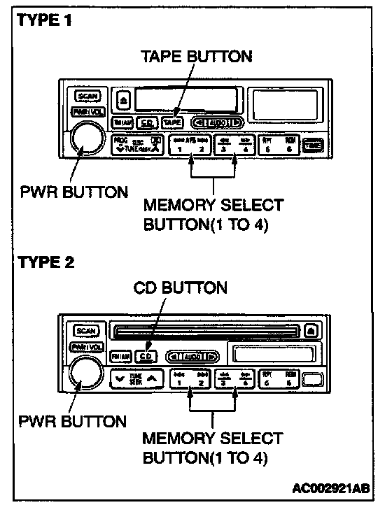 The radio, tape player and CD player do not work under the following conditions:- Power supply to the radio, tape player and CD player has been suspended for more than an hour continuously by removing the cable from the battery terminal or disconnecting the harness connectors.