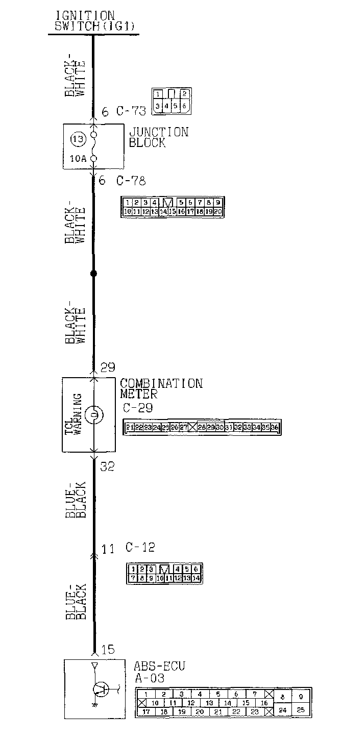 Check the continuity between combination meter connector C-29 and ABS-ECU connector A-03.