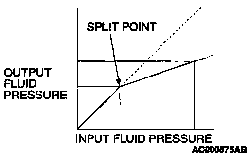 1. Output fluid pressure begins to drop relative to input fluid pressure (split point).