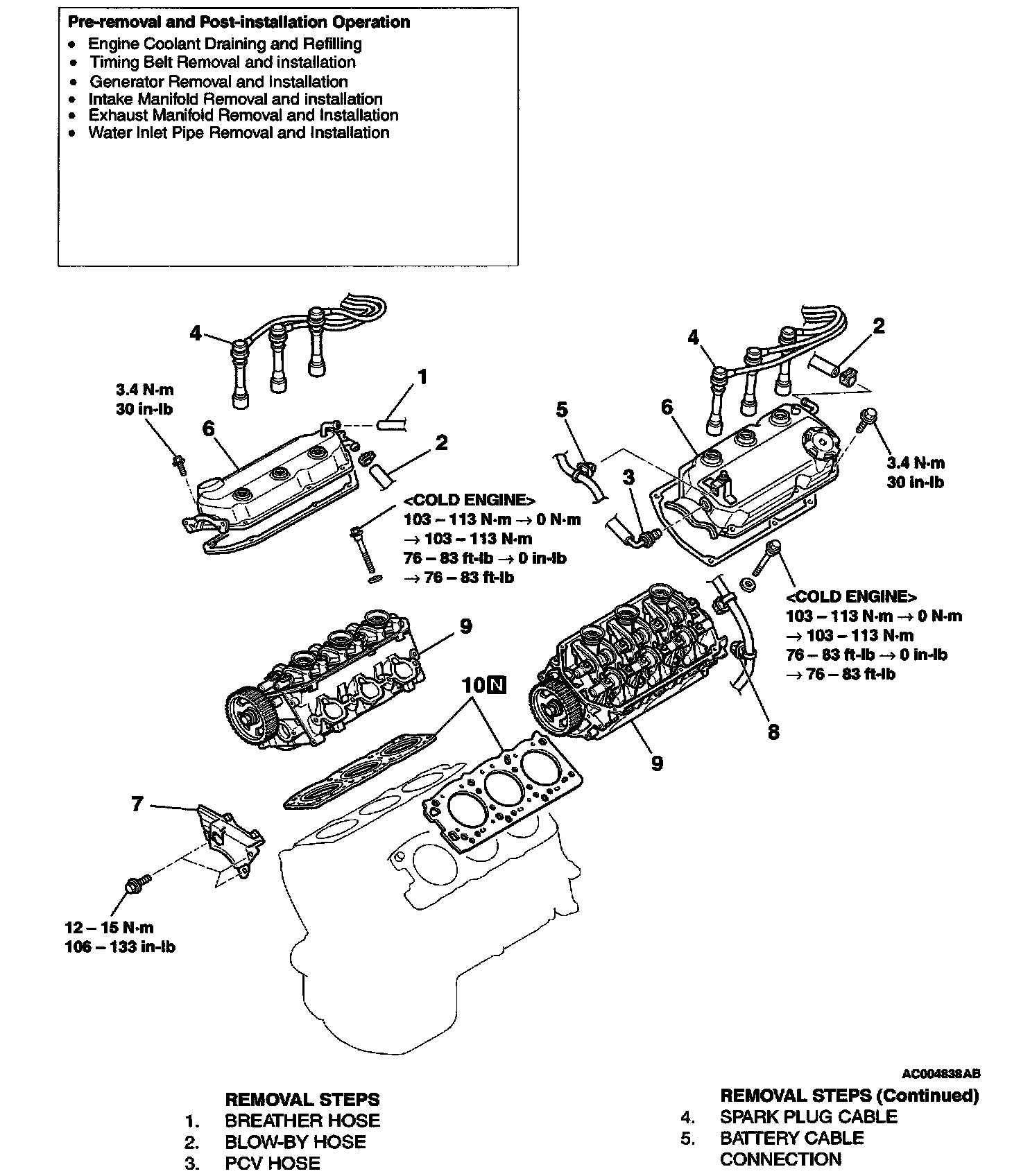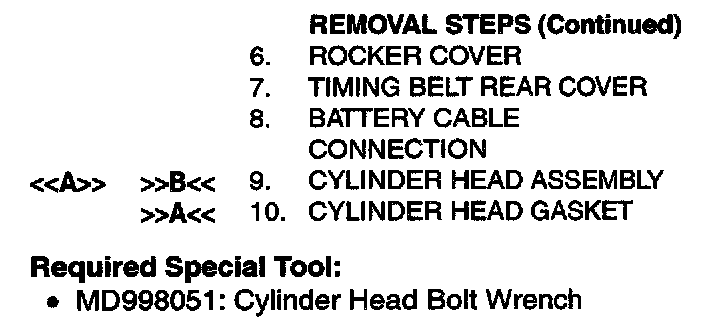 Using special tool MD998051, loosen the cylinder head bolts in two or three steps in the order of the numbers, then remove the cylinder head assembly.